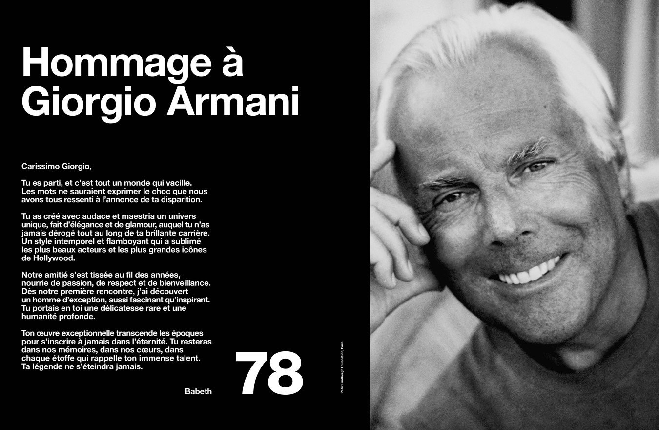 Un hommage au créateur Giorgio Armani, maestro de la mode italienne qui s’éteignait le 4 septembre dernier, laissant derrière lui un immense héritage, comme la réinvention du costume masculin et l’expansion du vêtement au lifestyle.