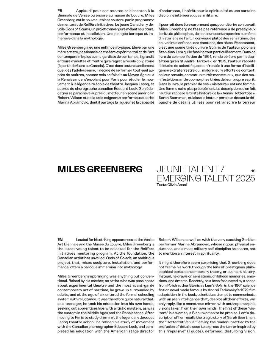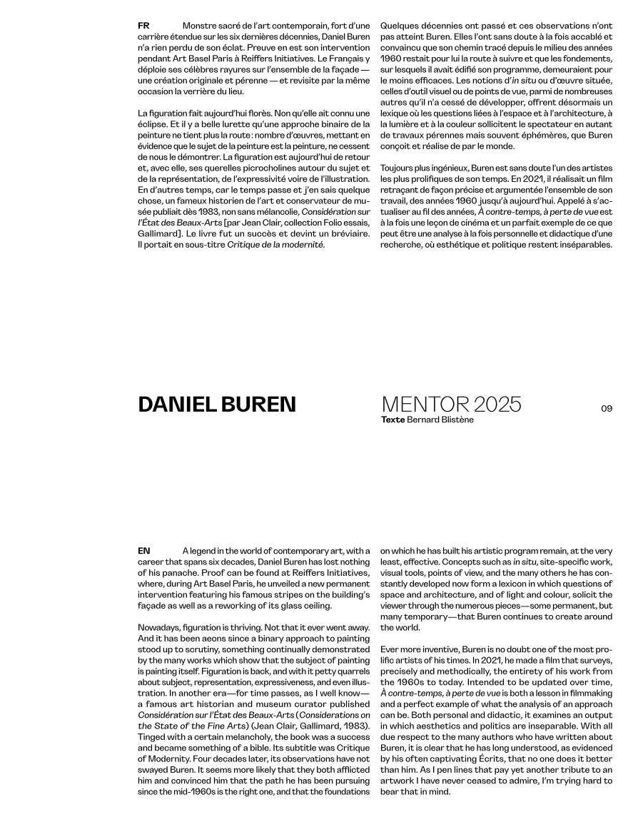 Daniel Buren & Miles Greenberg, est le huitième livre d’art de Reiffers Initiatives qui retrace l’édition 2025 du mentorat. Depuis 2021, Reiffers Initiatives se consacre au soutien des artistes émergents et à la promotion de la diversité culturelle dans la scène contemporaine française. Notre exposition de mentorat, qui réunit chaque année en octobre une grande figure internationale de l’art contemporain et un jeune artiste français, est un élément clé de cette mission.