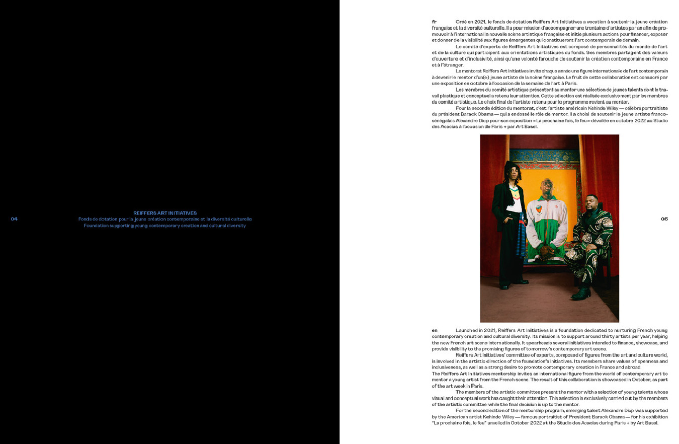 « La Prochaine Fois, Le Feu » est le troisième livre d’art de Reiffers Art Initiatives qui relate l’édition 2022 du mentorat entre les artistes Alexandre Diop et Kehinde Wiley. À travers une exposition à l’Acacias Art Center, cet ouvrage révèle un dialogue plastique riche entre un jeune talent issu de la scène artistique française et une figure internationale de l’art contemporain.