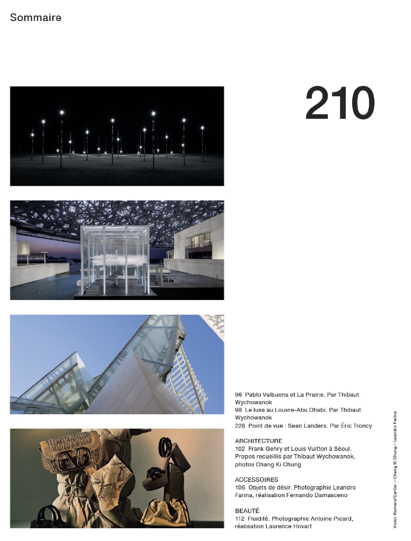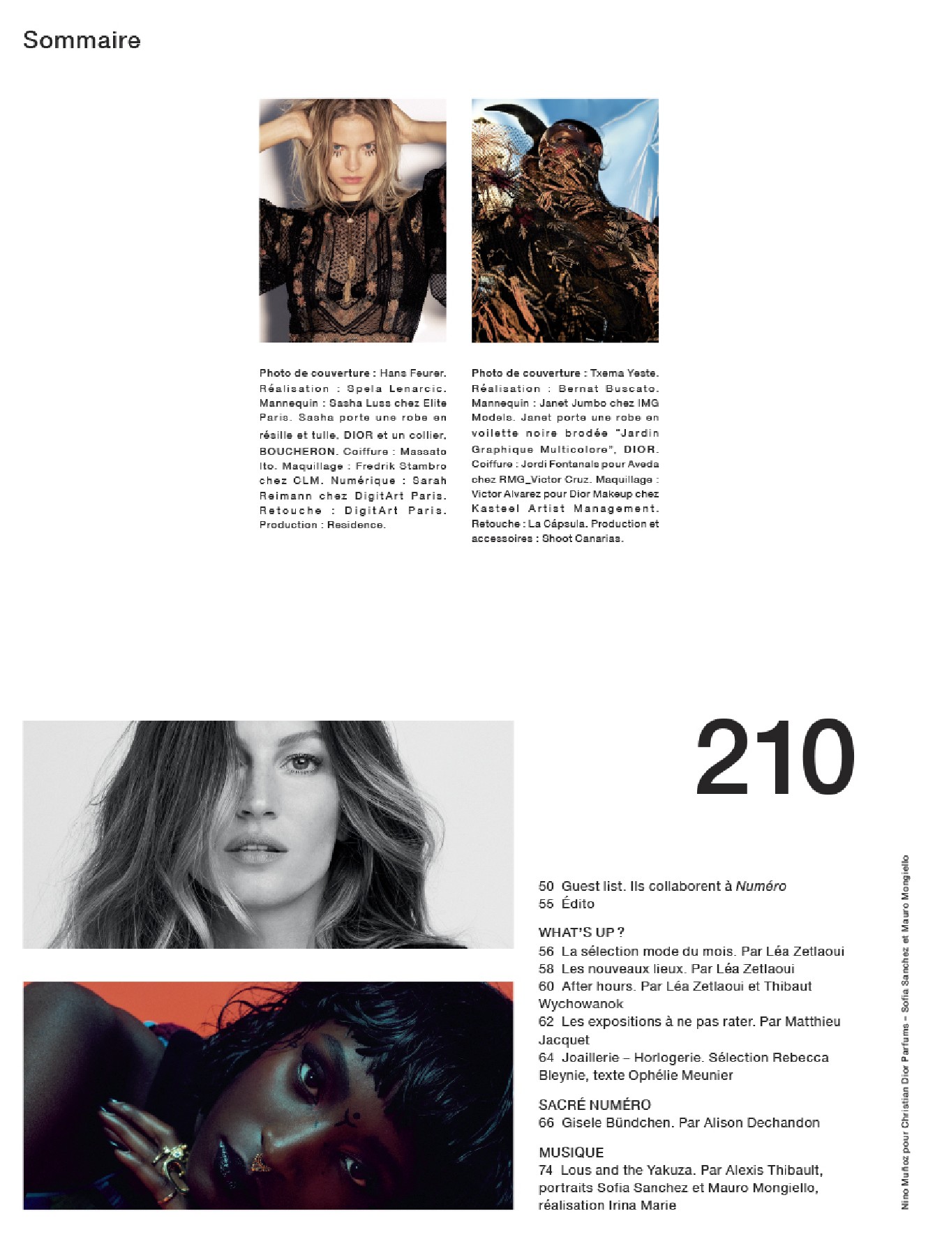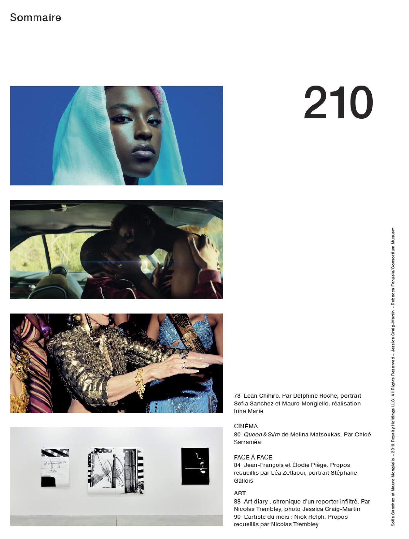Un portrait de la top model brésilienne Gisele Bündchen, une rencontre avec la jeune chanteuse belge Lous and the Yakuza, un face-à-face entre le chef Jean-François Piège et sa femme Élodie Piège, la critique de Queen & Slim, premier long-métrage de la réalisatrice afro-américaine Melina Matsoukas, un entretien avec Lean Chihiro, la rappeuse kawaï féministe, la civilisation des écrans vue par l’artiste Nick Relph, dix mille ans de luxe au Louvre-Abu Dhabi, une rencontre avec Frank Gehry et Louis Vuitton à Séoul, le journal intime de l’artiste Sean Landers transposé en tableaux, les œuvres de Richard Serra dans le désert du Qatar et les séries mode de Txema Yeste, Cameron McCool, Hans Feurer, Boo George, Billy Kidd, Sofia Sanchez et Mauro Mongiello et Marco van Rijt.