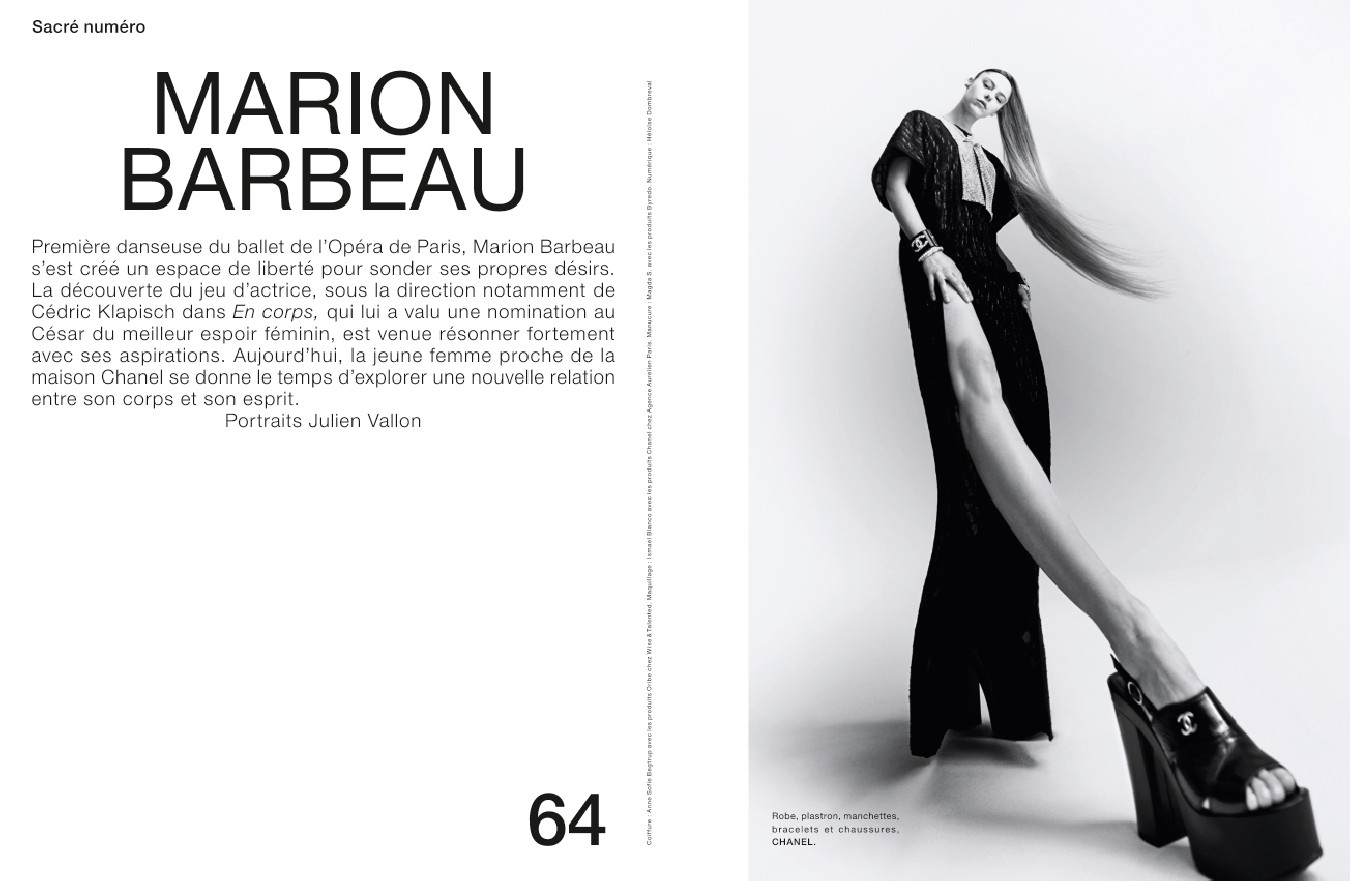 Marion Barbeau, la première danseuse du ballet de l’Opéra de Paris qui faisait récemment ses débuts au cinéma avec Cédric Klapisch ; une interview exclusive de l’icône Monica Bellucci, qui incarnera la photographe italienne Tina Modotti dans une série d’images signées Marcel Hartmann ; la jeune star du cinéma français Garance Marillier, bientôt à l’affiche du film Marinette ; une rencontre avec Alexandre Mattiussi, fondateur du label AMI, qui revient sur sa dernière collection ; les cosmogonies picturales de l’artiste américain Ouattara Watts à la galerie Cécile Fakhoury ; Vincent Fecteau, sculpteur passionné de formes énigmatiques ; une interview d’Adam Linder, le chorégraphe qui fait rentrer la danse dans l’espace d’exposition ; et les séries mode de Cho Gi-Seok, Koto Bolofo, Yulia Gorbachenko, Rory van Millingen, Elina Kechicheva et Txema Yeste.
