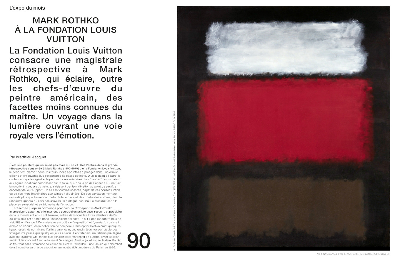 Grand rendez-vous de cet automne, la Fondation Louis Vuitton consacre une magistrale rétrospective à Mark Rothko, qui éclaire, outre les chefs-d’œuvre du peintre américain, des facettes moins connues du maître. Un voyage dans la lumière ouvrant une voie royale vers l’émotion.