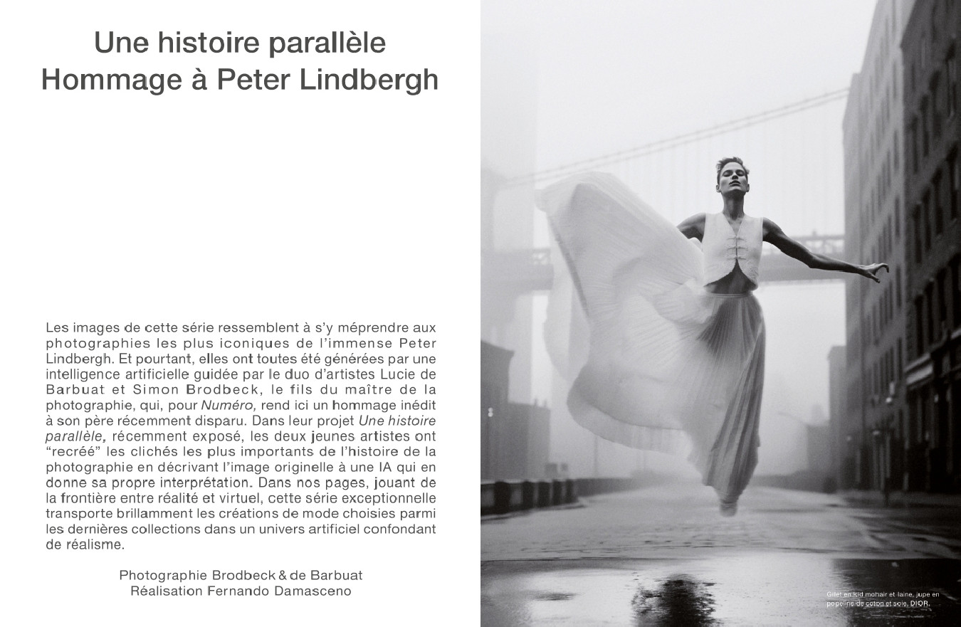 Ce Numéro dévoile enfin un hommage inédit : avec son épouse Lucie de Barbuat, l’artiste Simon Brodbeck recrée les clichés iconiques de son père Peter Lindbergh en utilisant l’intelligence artificielle, composant des images saisissantes aux confins des époques.