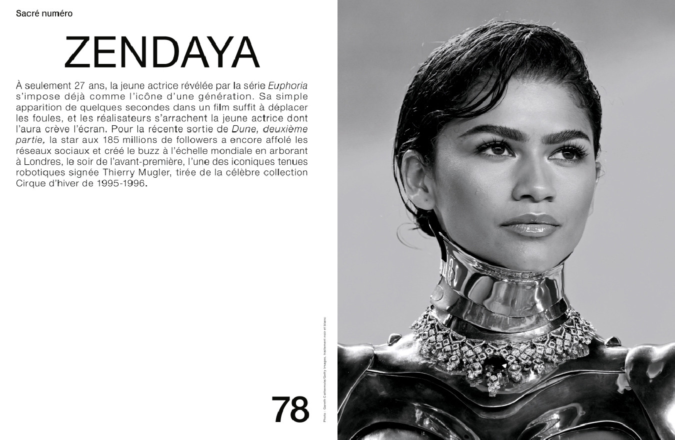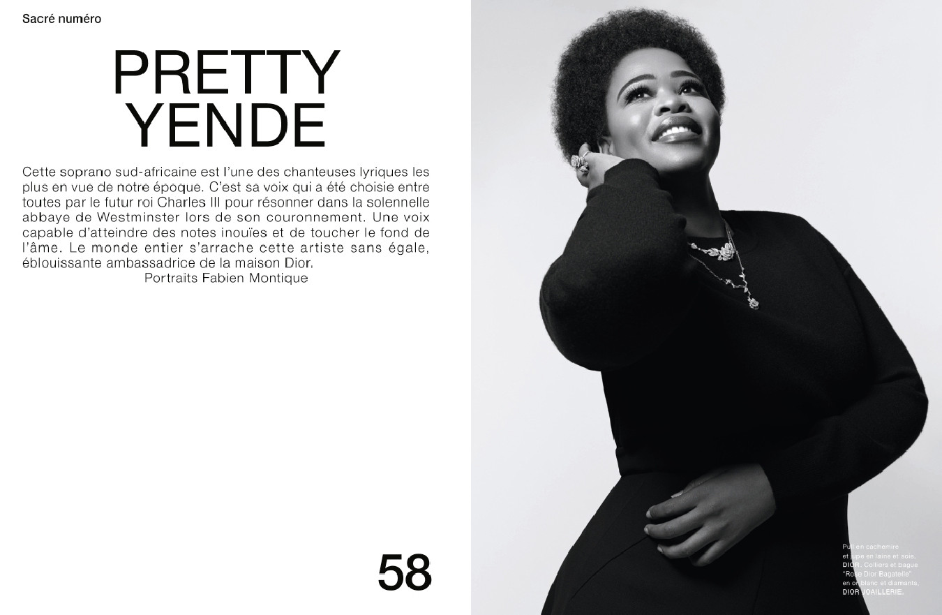 Un portrait de Pretty Yende, soprano sud-africaine parmi les plus en vue de notre époque, photographiée dans ce Numéro par Fabien Montique ; un portfolio de l’immense photographe Paolo Roversi, mis à l’honneur par une grande exposition au Palais Galliera ; l’ascension fulgurante de l’actrice et chanteuse Zendaya, nouvelle icône d’une génération, actuellement à l’affiche du deuxième volet de Dune ; et la révélation du cinéma français Nadia Tereszkiewicz, qui campe un rôle étonnant dans le film Rosalie de Stéphanie Di Giusto, et se dévoile ici sous l’objectif de Luc Braquet.
