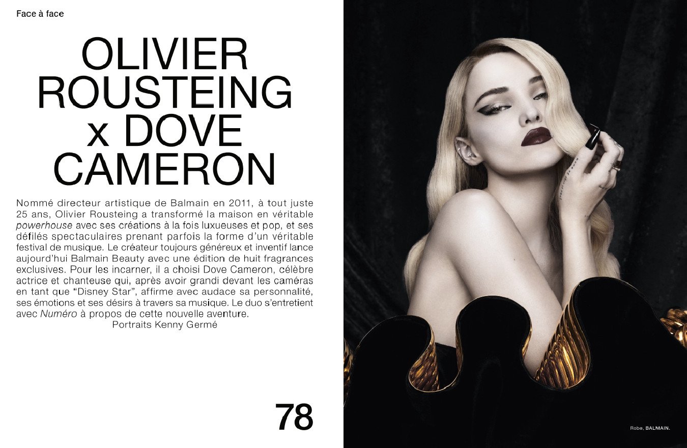 Les confessions de l’actrice iconique Monica Bellucci, photographiée par Jean-Baptiste Mondino, sur ses 30 ans d’amitié avec la maison Dolce&Gabbana ; un face à face entre le grand couturier Jean Paul Gaultier et le jeune créateur Nicolas di Felice, invité en juin dernier à signer la dernière collection haute couture de la maison française ; mais aussi un entretien avec Olivier Rousteing pour le lancement première ligne de beauté Balmain, avec son égérie Dove Cameron, en couverture de ce Numéro sous l’objectif de Kenny Germé.