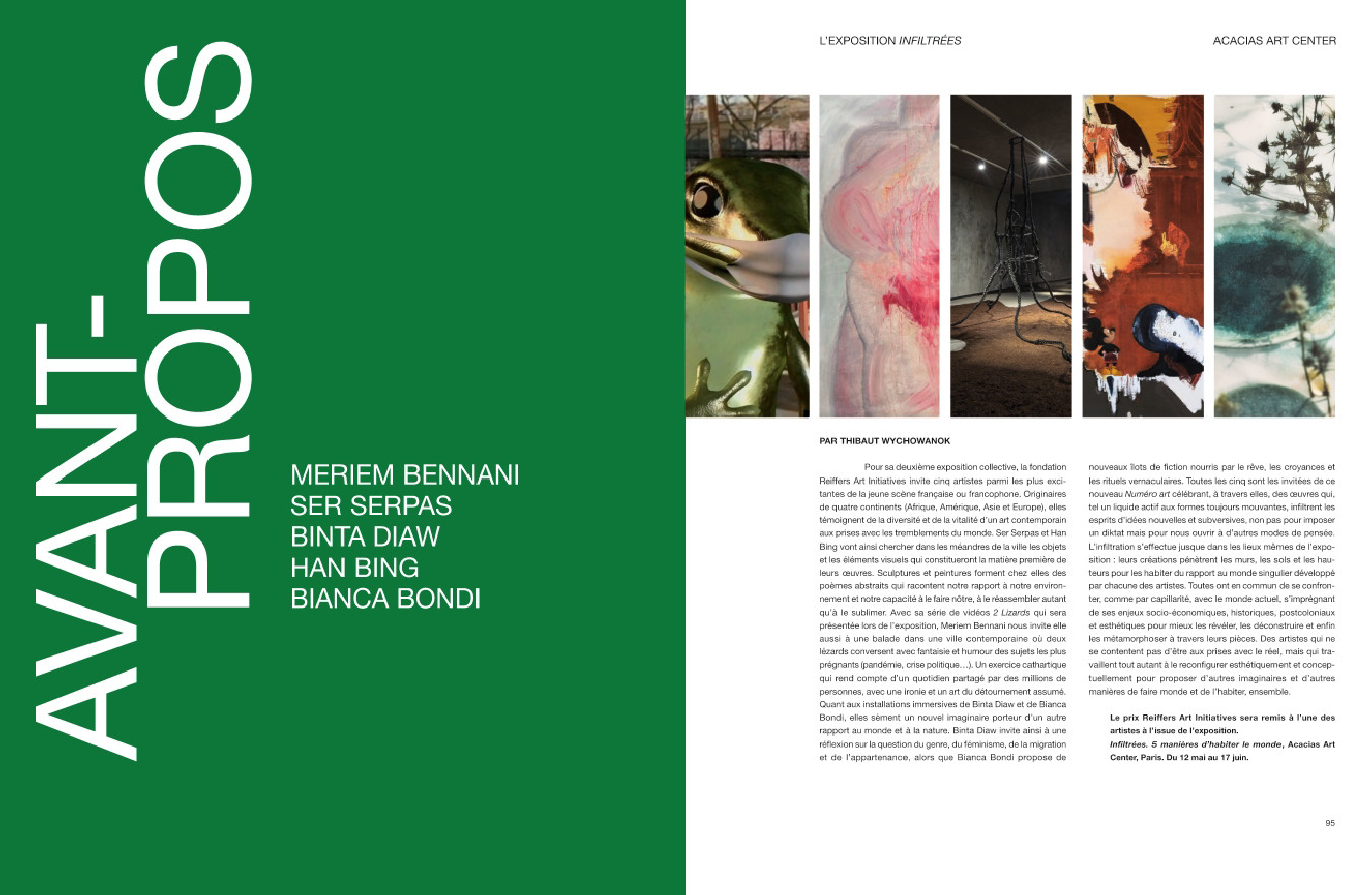 Ce nouveau Numéro art donne également la parole à toute une passionnante nouvelle génération d’artistes à travers les vidéos et installations si humoristiques et subtiles de Meriem Bennani, l’une des plus influentes de sa génération, les œuvres fulgurantes et intenses de Ser Serpas (bientôt exposées à la Bourse de commerce à Paris), les installations éco-féministes de Binta Diaw, les peintures audacieuses et colorées de Han Bing, et les créations mystiques de Bianca Bondi. Cinq artistes femmes exceptionnelles exposées par la fondation Reiffers Art Initiatives ce printemps à Paris. Une fois de plus, Numéro art rend hommage à la vitalité de la scène française avec les peintures oniriques de Julie Beaufils et l’œuvre sensible et poétique de Benoît Piéron. Ce Numéro dévoile également une série de toiles inédites et subversives de l’artiste béninois Roméo Mivekannin. Et bien sûr, une sélection des expositions essentielles de la saison et un focus sur les Rencontres de la photographie d’Arles.