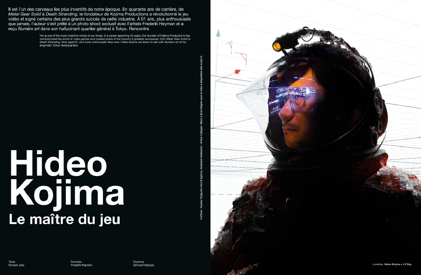 C’est devenu une habitude,  Numéro art s’aventure cette saison encore hors des sentiers de l’art contemporain à la découverte d’autres formes de création. Hideo Kojima, légende iconoclaste du jeu vidéo à l’imagination débordante, nous ouvre ainsi les portes de son studio à Tokyo. À 61 ans, le Japonais est aujourd’hui l’un des auteurs les plus courtisés par le Tout-Hollywood et le monde de la musique. Pour  Numéro art, il a accepté de se faire scanner en 3D afin d’intégrer les images numériques exclusives de l’artiste Frederik Heyman. Leurs deux univers, influencés par la science-fiction et le fantastique, étaient faits pour se rencontrer.