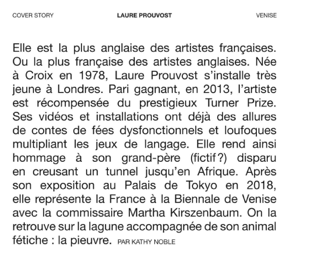 Pour son 4ème opus, Numéro art propose trois couvertures exceptionnelles : d’abord, une excursion dans le domaine de la musique avec la pop star Billie Eilish, l’Américaine qui fascine déjà les artistes (dont un certain Takashi Murakami…). Puis, la mystérieuse Laure Prouvost que Numéro art a suivi à Venise où ses œuvres loufoques et poétiques investissent le Pavillon français pendant la Biennale. Enfin, le légendaire peintre Rudolf Stingel nous reçoit dans son atelier new-yorkais avant sa rétrospective à la fondation Beyeler, en pleine foire d’Art Basel.