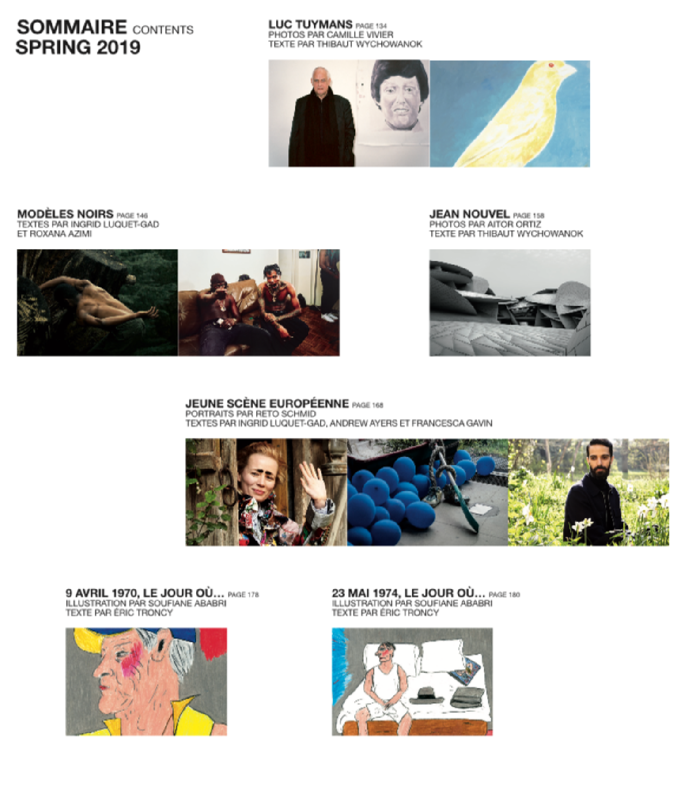 Numéro art #4, c’est aussi toutes les autres personnalités et évènements qui vont compter de mars à août 2019, et notre TOP 40 des expositions à ne pas rater. Au programme : des rencontres avec les créateurs qui font l’art d’aujourd’hui (Anne Imhof, Thomas Houseago, Luc Tuymans, Jean Nouvel), et des focus sur la jeune création (Jon Rafman, Hicham Berrada, Oliver Beer).