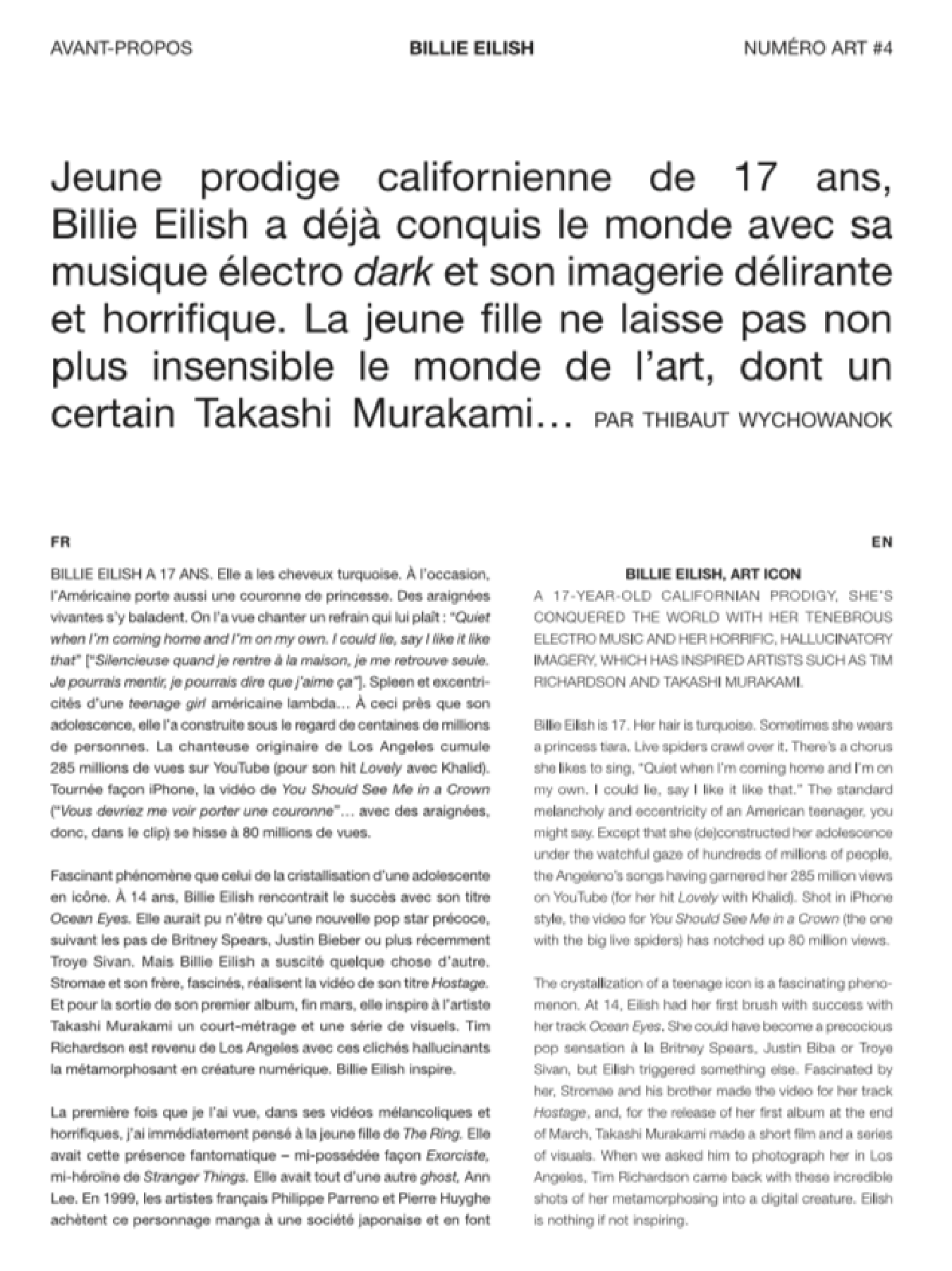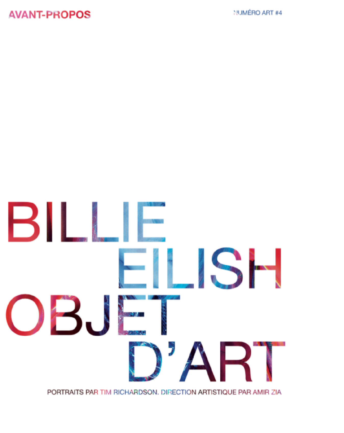 Pour son 4ème opus, Numéro art propose trois couvertures exceptionnelles : une excursion dans le domaine de la musique avec la pop star Billie Eilish, l’Américaine qui fascine déjà les artistes (dont un certain Takashi Murakami…). La mystérieuse Laure Prouvost que Numéro art a suivi à Venise où ses œuvres loufoques et poétiques investissent le Pavillon français pendant la Biennale. Enfin, le légendaire peintre Rudolf Stingel nous reçoit dans son atelier new-yorkais avant sa rétrospective à la fondation Beyeler, en pleine foire d’Art Basel.