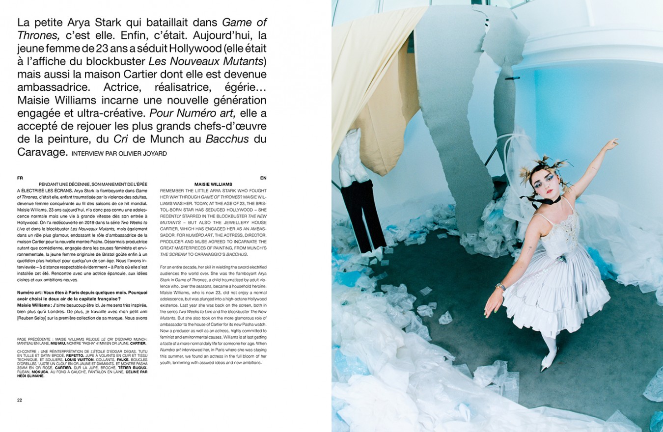 Le magazine référent sur l’art contemporain international a suivi Oscar Murillo dans son atelier en Colombie. L’artiste à l’ascension fulgurante est à l’honneur avec une nouvelle exposition à Paris. Autre cover star de cette édition, la jeune actrice Maisie Williams, iconique Arya Stark de Game of Thrones, a réinterprété les plus grands chefs-d’oeuvre de la peinture devant l’objectif de Lee Wei Swee. La jeune Britannique rejoue pour Numéro art Le Cri d’Edvard Munch ou encore le Bacchus de Caravage. Parcourir les pages de Numéro art, c’est aussi découvrir les personnalités et les créateurs qui comptent : une rencontre exclusive avec le power couple de l’art, les fondateurs de la galerie Hauser & Wirth Manuela & Iwan Wirth, en discussion avec le coprésident de l’institution Marc Payot, une création originale de Martin Margiela à l’occasion de sa première exposition en tant qu’artiste total, Adrián Villar Rojas et ses sculptures monumentales d’animaux et de vestiges imaginaires, le designer Martin Szekely et ses objets singuliers qui ont séduit François Pinault et le Louvre… Aux côtés bien sûr, de portraits du légendaire Juergen Teller et d’une série mode consacrée à la jeune scène française par François Quillacq.