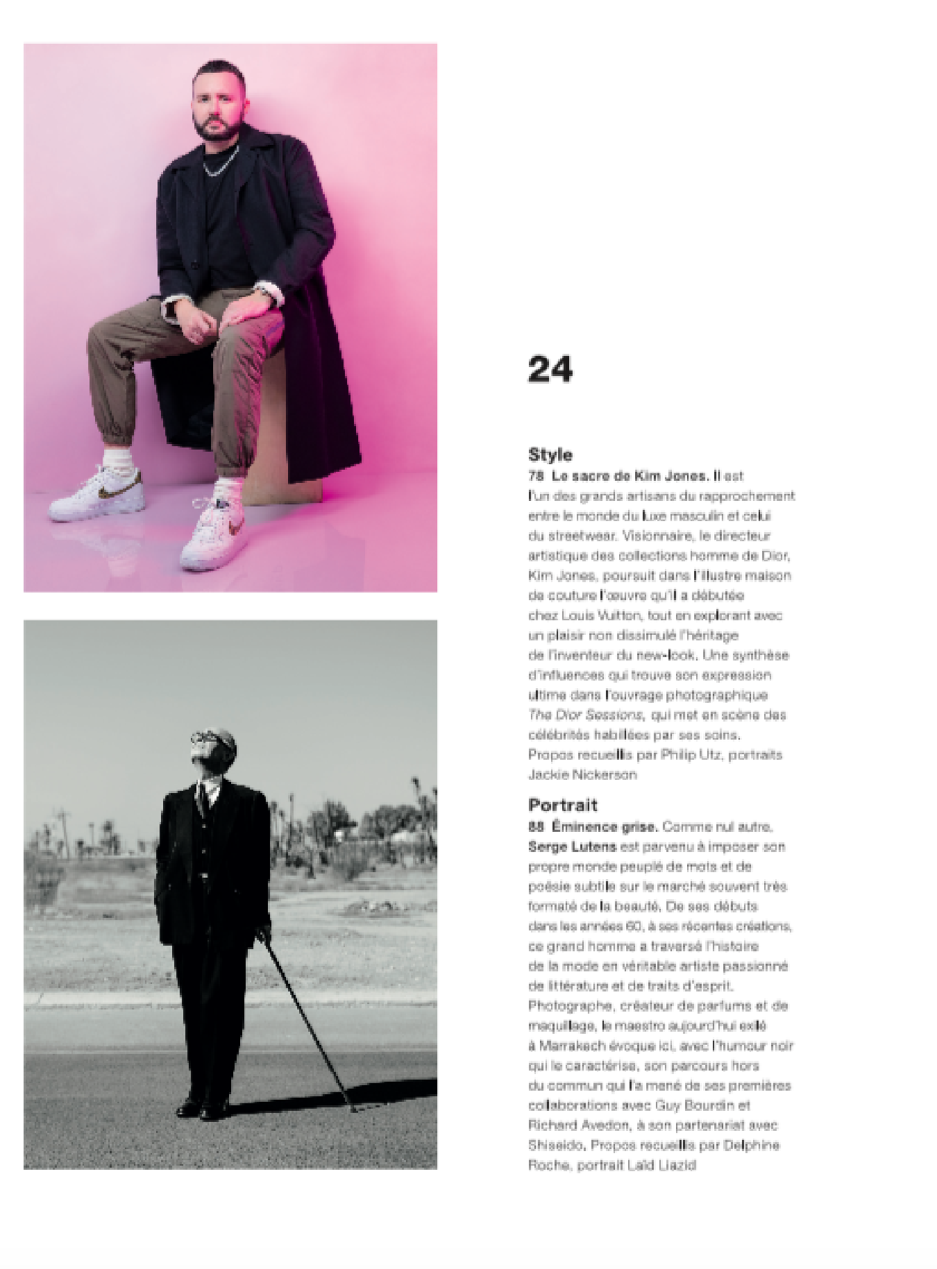 Un portfolio exclusif en hommage au photographe Peter LINDBERGH, un portrait de Mati DIOP, la sensation du Festival de Cannes, les confessions de Juliette BINOCHE, le directeur artistique de Balmain, Olivier ROUSTEING, héros du documentaire Wonder Boy, une rencontre avec Delphine ARNAULT et un portrait des lauréats du 6e prix LVMH, un face-à-face électrique entre Joey STARR et Béatrice DALLE à l’affiche de la pièce de théâtre « Elephant Man », le peintre américain Louis FRATINO, les pièces maîtresses du PAD London, un portrait du rappeur Swae LEE, star montante du hip-hop américain, la pop volcanique de Charli XCX, les toiles de l’artiste Louise SARTOR, artiste invitée à la villa Medicis, l’architecture grandiose de Naturalis aux Pays-Bas qui abrite le T-Rex le plus complet du monde et les séries mode de Jean-Baptiste MONDINO, Cameron McCool, Txema Yeste, Kacper KASPRZYK, Valentin B. GIACOBETTI et Sofia SANCHEZ et Mauro MONGIELLO.