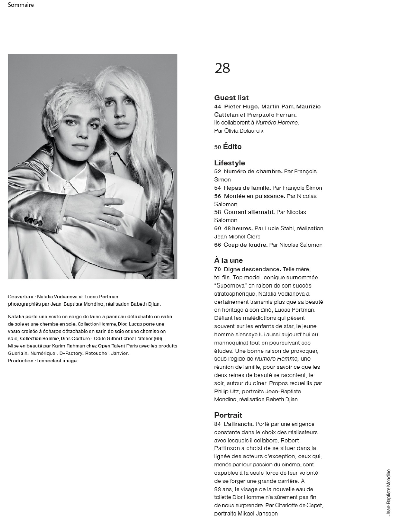 Une rencontre avec la top model Natalia “Supernova” Vodianova et son fils Lucas Portman – Un portrait de Robert Pattinson, l’un des acteurs les plus exigeants de sa génération – Les frères Humberto et Fernando Campana, stars mondiales du design – EXCLUSIF ! : Une immersion dans les couloirs de la California State Prison de Los Angeles, où d’anciens membres de gangs s’essaient à la danse sous l’objectif du photographe d’art Pieter Hugo – Une série de Polaroid exclusifs du photographe et maquilleur star Stéphane Marais – Les directeurs artistiques (et jumeaux) du label Dsquared2, Dean et Dan Caten, – Et les séries mode exclusives signées Jean-Baptiste Mondino, Martin Parr, Dominique Issermann, Alex Antitch et Erwan Frotin.