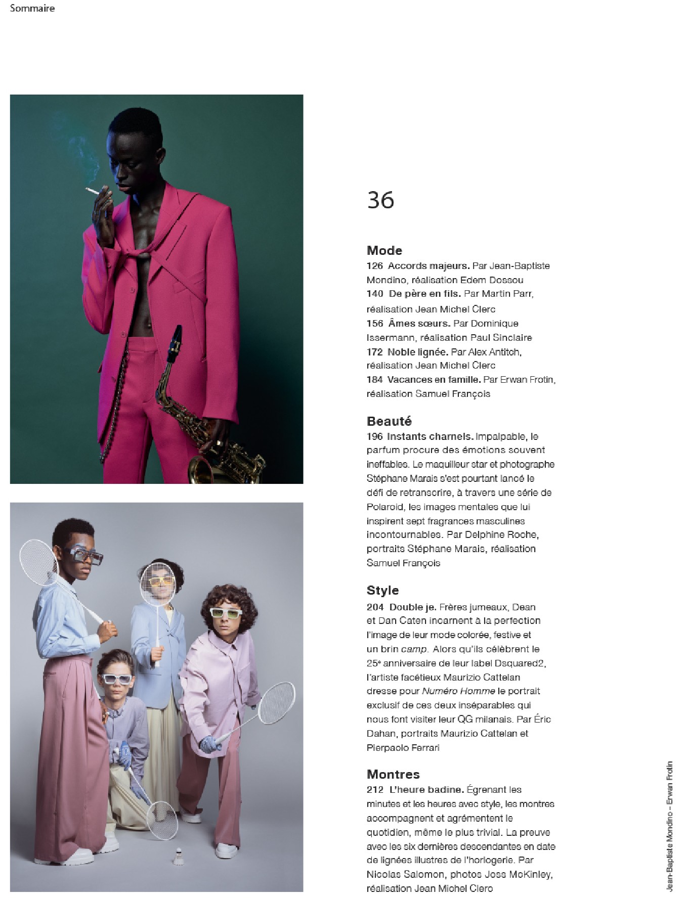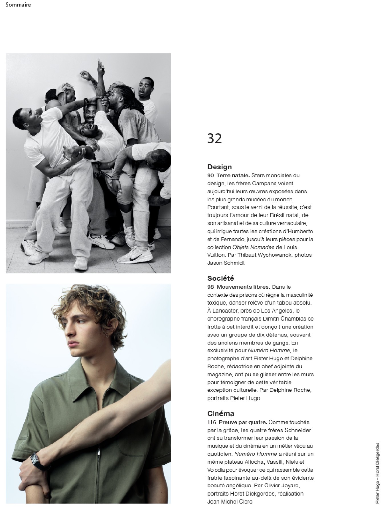 Une rencontre avec la top model Natalia “Supernova” Vodianova et son fils Lucas Portman – Un portrait de Robert Pattinson, l’un des acteurs les plus exigeants de sa génération – Les frères Humberto et Fernando Campana, stars mondiales du design – EXCLUSIF ! : Une immersion dans les couloirs de la California State Prison de Los Angeles, où d’anciens membres de gangs s’essaient à la danse sous l’objectif du photographe d’art Pieter Hugo – Une série de Polaroid exclusifs du photographe et maquilleur star Stéphane Marais – Les directeurs artistiques (et jumeaux) du label Dsquared2, Dean et Dan Caten, – Et les séries mode exclusives signées Jean-Baptiste Mondino, Martin Parr, Dominique Issermann, Alex Antitch et Erwan Frotin.